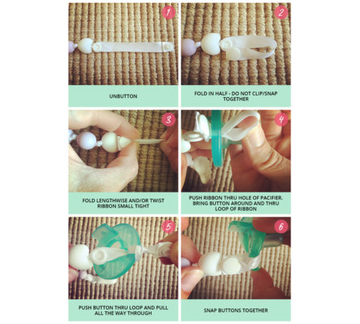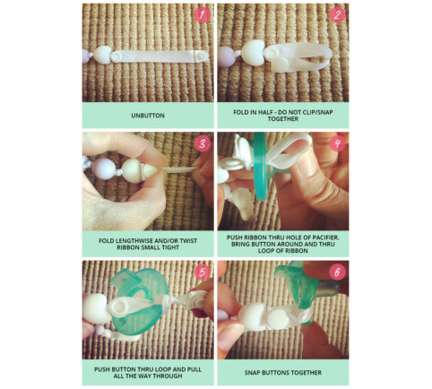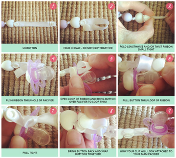 Below you will find instructions for attaching your pacifier clips to both the MAM and Soothie (scroll down) pacifiers. Please don’t hesitate to contact us with any questions.