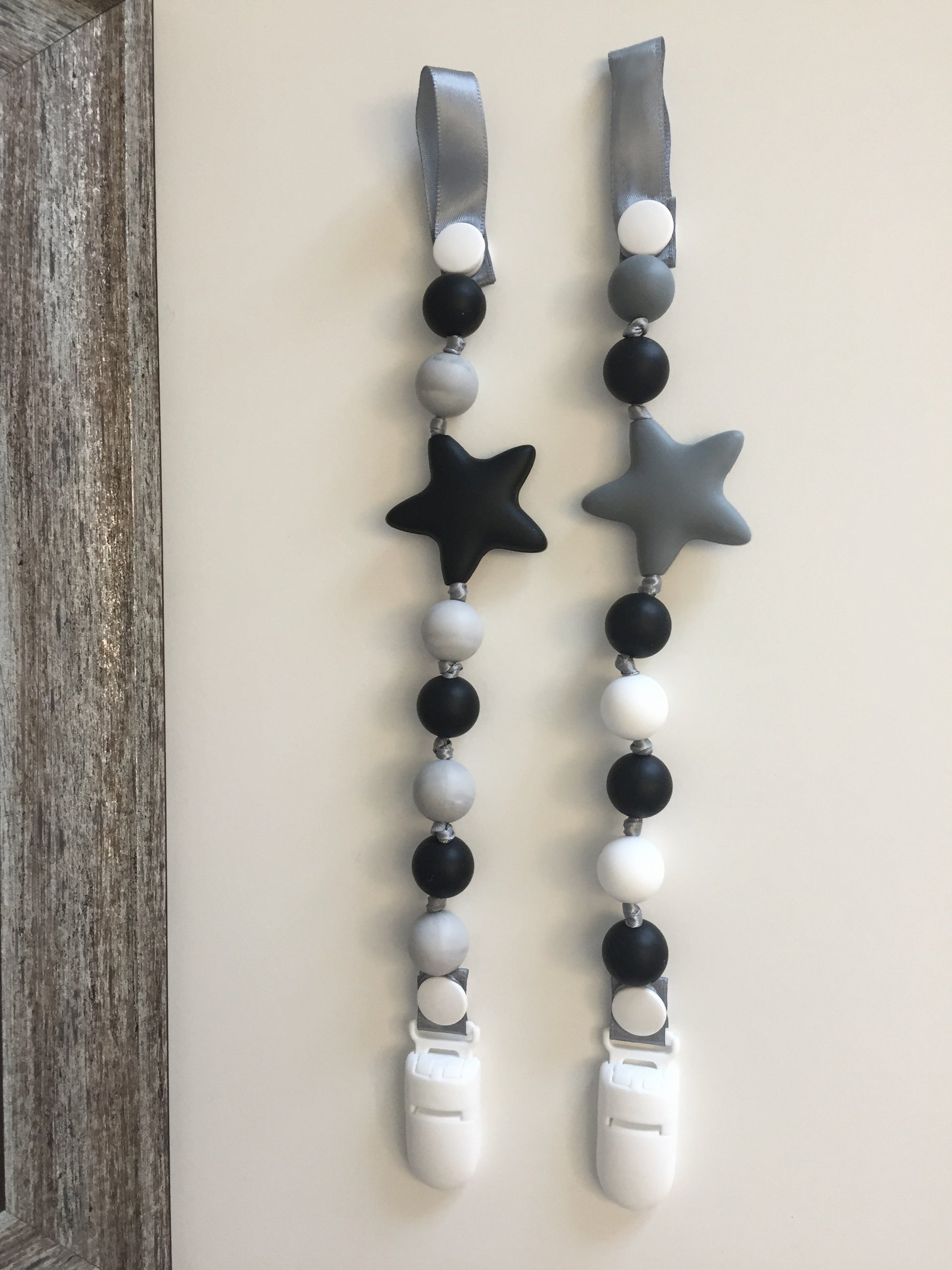 The Little Rock Star Pacifier Clips are on trend and the newest addition to our star clip collection! Our clips are universal, working with all pacifiers, including Nuk, MAM, and Soothie.
